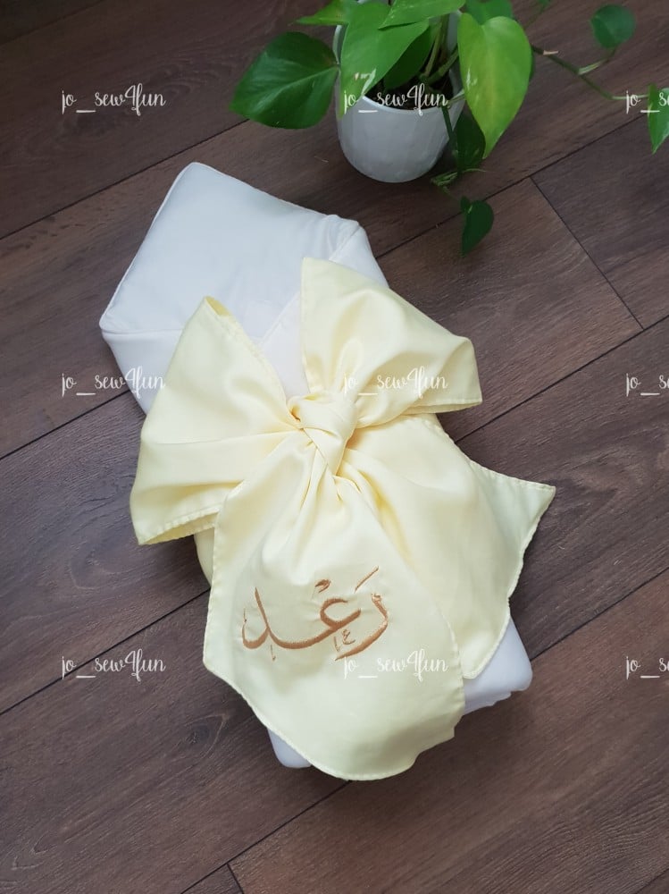 - ابعاد المفرش مربع 65*65 سم مع شريطة الفيونكة العريضه المنفصلة